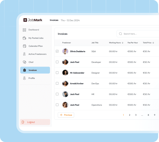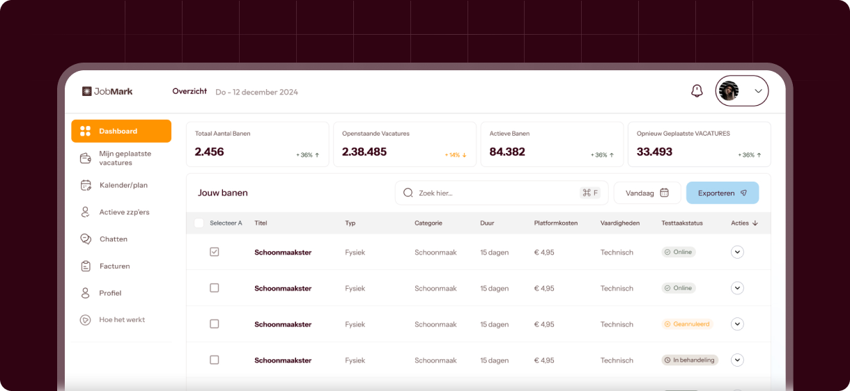 Het opdrachtgevers dashboard biedt een realtime overzicht van alle activiteiten. Beheer met een klik op de knop lopende opdrachten, monitor gewerkte uren en beoordeel prestaties. Alles wat je nodig hebt om grip te houden op planning en productiviteit van jouw projecten.